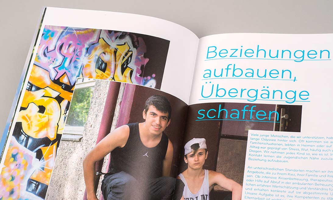 »Die Motive für diese Bilder sind Verweise auf das urbanen Umfeld der Jugendlichen, jungen Erwachsenen und Familien und Ausdruck von Diversität, Nonkonformismus, Eigenwilligkeit und Kreativität im städtischen Umfeld des Trägers und seiner Klienten. Als Abbildungen dienen Verwerfungen, Brüche, Zufälliges, Liegengelassenes, Weggeworfenes, Gewachsenes, ein Nebeneinander von Übermalungen, Farbklecksen, überklebten und abgerissener Plakaten, zufälliger Überlagerungen von Street-Art, verwitterten Hausfassaden, zerschlagenen Scheiben, liegengelassenem Hausrat. Es sind Ergebnisse bewusster oder zufälliger Handlungen oder Vermeidungen — ein vitales Abbild der gesellschaftlichen Realität und der Veränderungen im Stadtraum.«